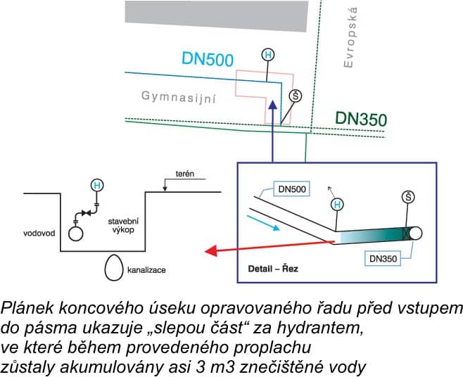 - Zvolené technické řešení opravy výpusti na dolním konci řadu v květnu 2015: nevyhovující výpust na křižovatce ulic Gymnasijní x Evropská nahrazena podzemním hydrantem DN 80 s uložením T kusu nahoru, situovaným cca 10 m od klapky, kde se opravovaný řad napojuje na paralelní přívodný řad. Toto řešení nedovolovalo účinný proplach celého řadu, protože za hydrantem zůstalo asi 10 m koncového úseku řadu se sklonem vzhůru.
